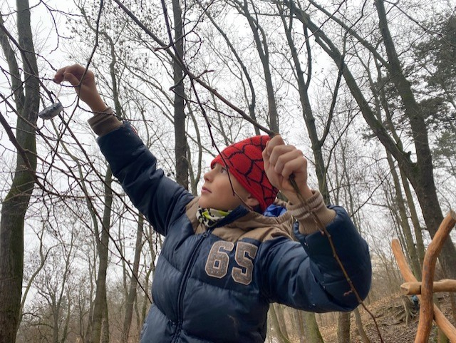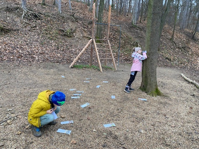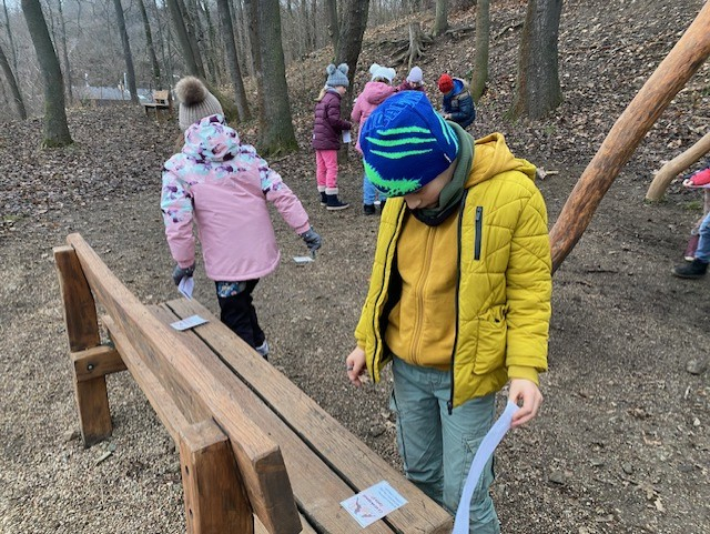 Chodíme se učit i ven, kde z přírodnin tvoříme písmenka, geometrické tvary nebo pozorujeme stromy a hledáme plody různých stromů.